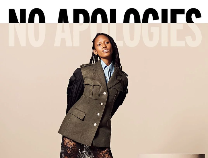 Adesuwa Aighewi has got words in this new campaign for American department store Saks Fifth Avenue. Tagged “No Apologies: Inspiring Women On Owning Their Power,” the campaign features the Nigerian American model in Prada. She dons a military-esque jacket and a black high waist floral lace skirt from the brand. She wore a blue poplin military button shirt inside.
