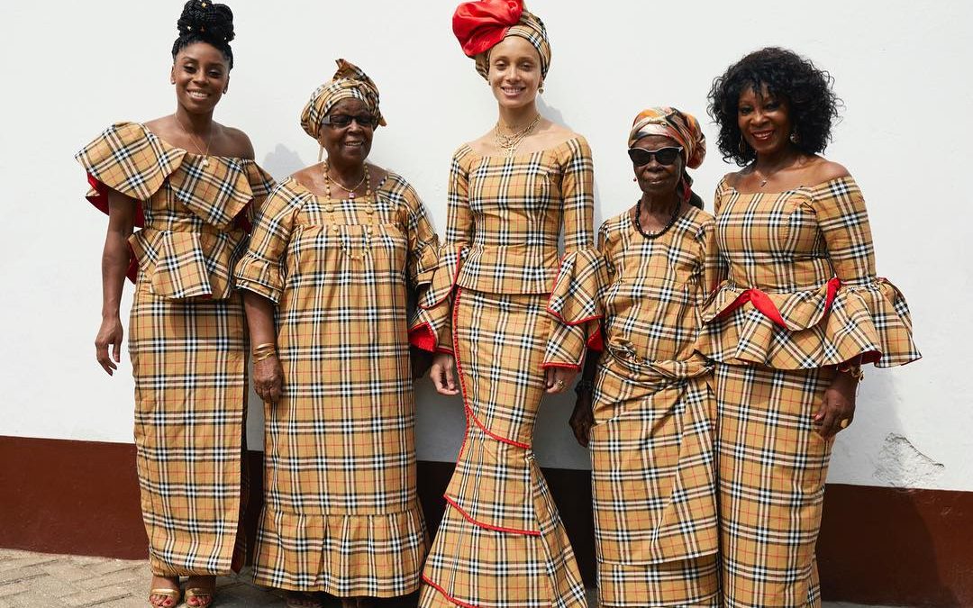 For this part, she went back to her roots; Ghana for a family campaign shot. In the photo, she and four women including her grandmother and aunts are shown wearing traditional Ghanaian dresses designed by her aunt but made of vintage Burberry fabrics. In the caption, Adwoa shares her relationship to her heritage in Ghana where her father was born, and how it has shaped her.