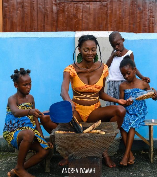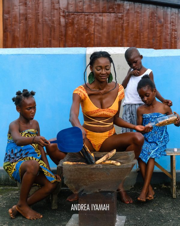 Nigerian supermodel, Oluchi Orlandi is adorned in bright Andrea Iyamah swimsuit pieces alongside energetic Nigerian children.