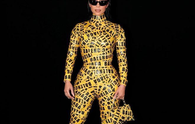 Kim Kardashian turned heads when she showed up at Balenciaga‘s Fall 2022 Paris Fashion Week show wrapped in bright yellow/black tape, topping off her outfit with a matching bag. Originally believed to be a custom accompaniment for her look, Balenciaga has now made the striking bag available. The “Hourglass…