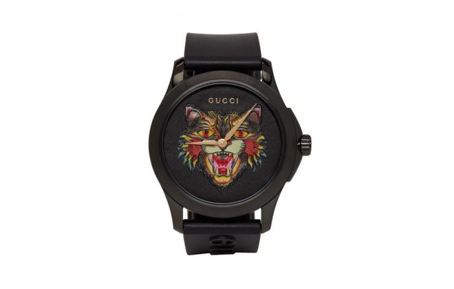 Gucci, once again, borrows from its earlier jungle cat theme to create yet another slick watch iteration. The Black G-Timeless Angry Cat Watch features a Swiss-made PVD-coated stainless steel structure, with a flat sapphire crystal lens, and gunmetal-toned hands, which sits atop the statement feline graphic. Powered…