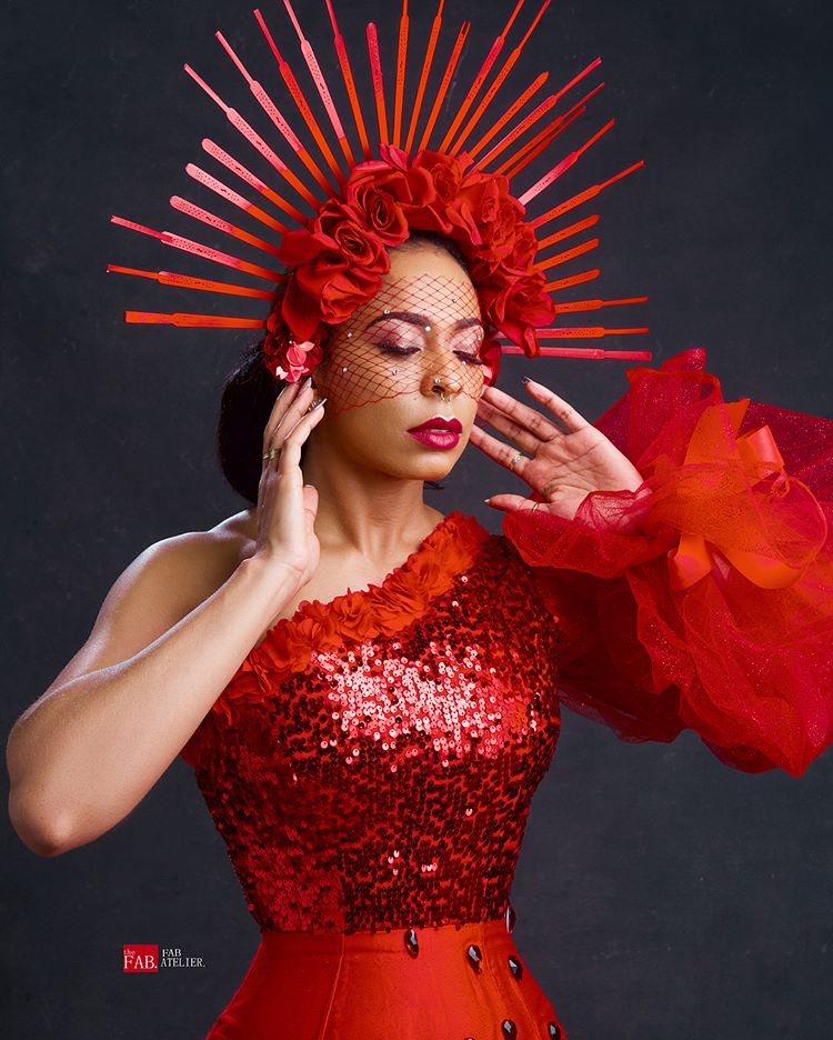 For the shoot, Tboss rocked a mono-strap detail-rich dress with a matching red goddess-like fascinator. Her facebeat which was done by Senorabiba featured nude eye glam and red lippie. The photos were taken by Fabolousbanji.