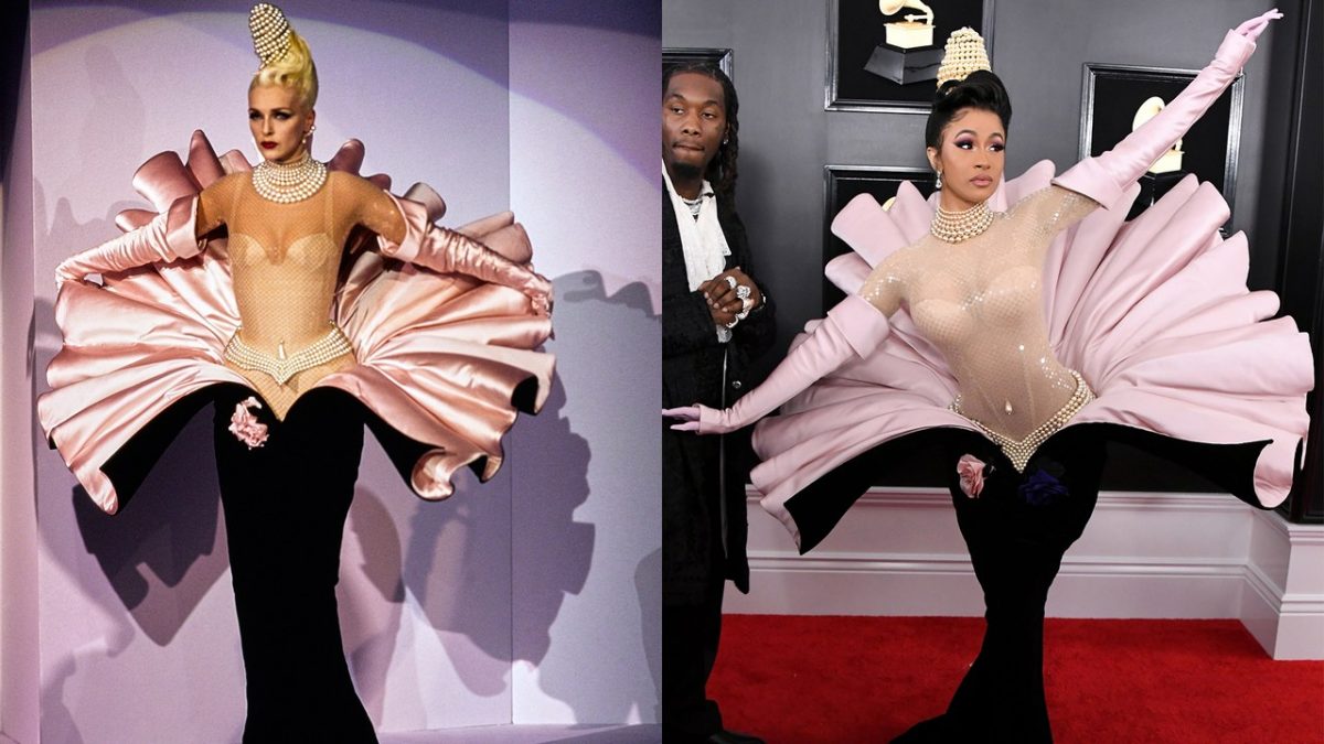 Serving spectators on a bit of a history lesson, Cardi wore an archival look (Look 130, to be specific) from Mugler’s Fall 1995 Couture show, originally shown at the Cirque d’Hiver, an iconic venue in Paris, as part of the label’s then-20th anniversary party. It was all extravagantly over-the-top and filled with exquisite showmanship; Mugler’s signature sculptural suits mixed in with theatrical coats and hats and gloves.