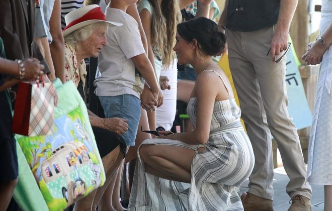Meghan Markle and Prince Harry locked hands as they walked along a jetty on picturesque Queensland’s Fraser Island. Meghan Markle was seen wearing a sleeveless ankle – length transparent dress exposing her longs legs. Meghan looked stunning in this outfit and we love how she paired this dress…