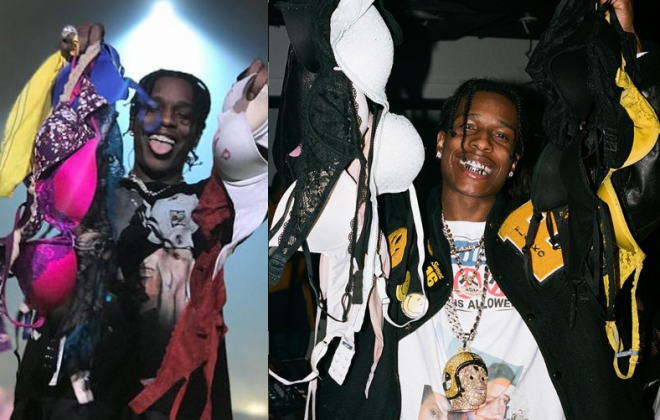 Rapper A$AP Rocky Shows Off Different Sizes Of Bras Thrown At Him On Stage