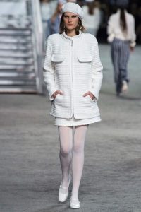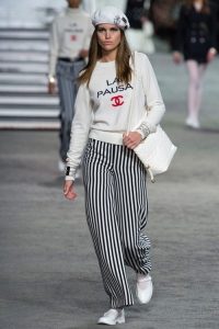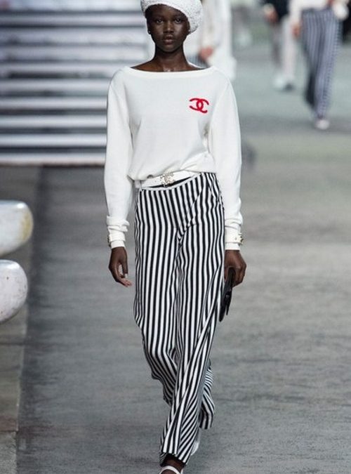 French luxury mega-brand Chanel is notorious for its larger-than-life runway presentations, and last night’s spectacle proved no different. Taking over Paris’s Grand Palais, Karl Lagerfeld transformed the space into a massive marina complete with a life-size ocean liner named after Coco Chanel’s villa in Roquebrune-Cap-Martin, France, “La Pausa.” Keeping with the show’s nautical theme, the collection, comprised of over 90 looks, was a vast assortment of pastel-hued tweeds, striped dresses and metallic leathers. Hats proved to be the show’s most prominent accessory, with every look topped with either a straw hat, sun hat or beret.