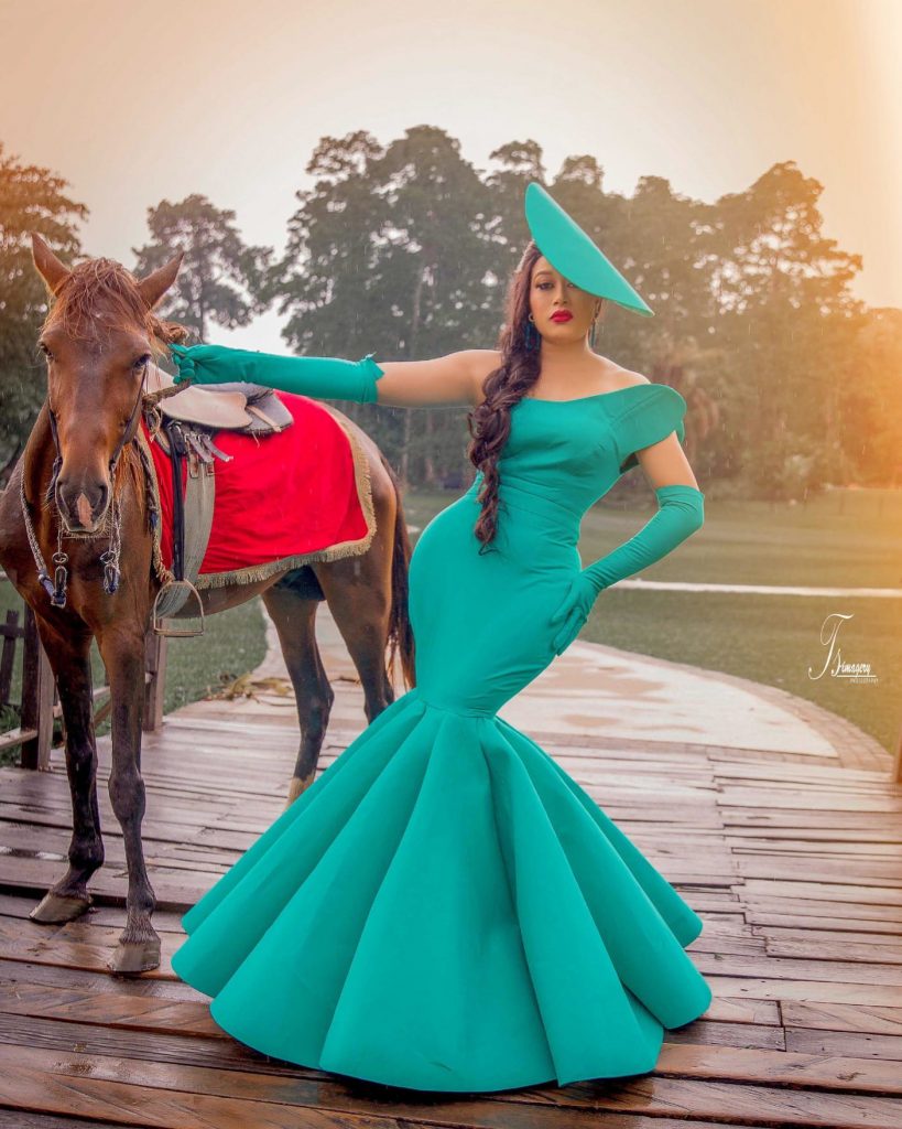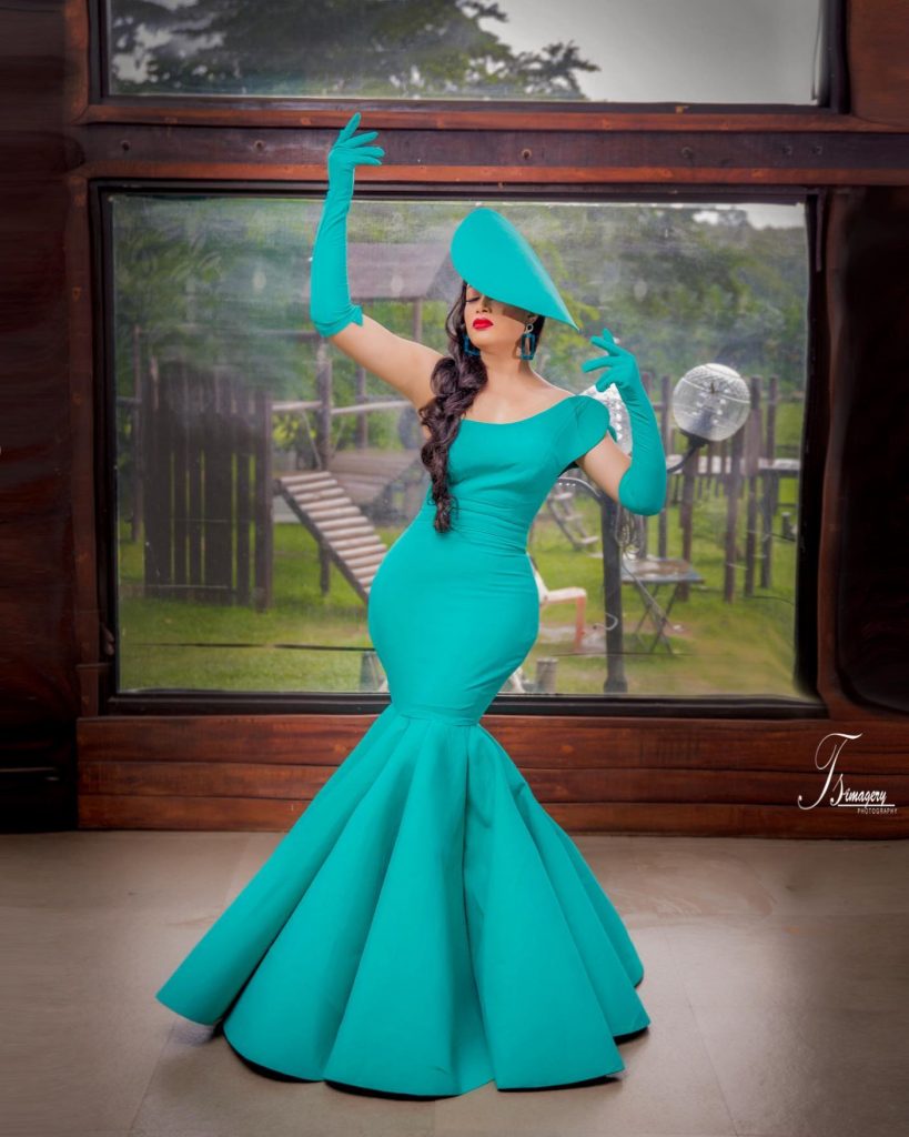 We have her featured in a turquoise blue mermaid gown which gives an artistic view of her enticing spoon shape and well-defined waist.