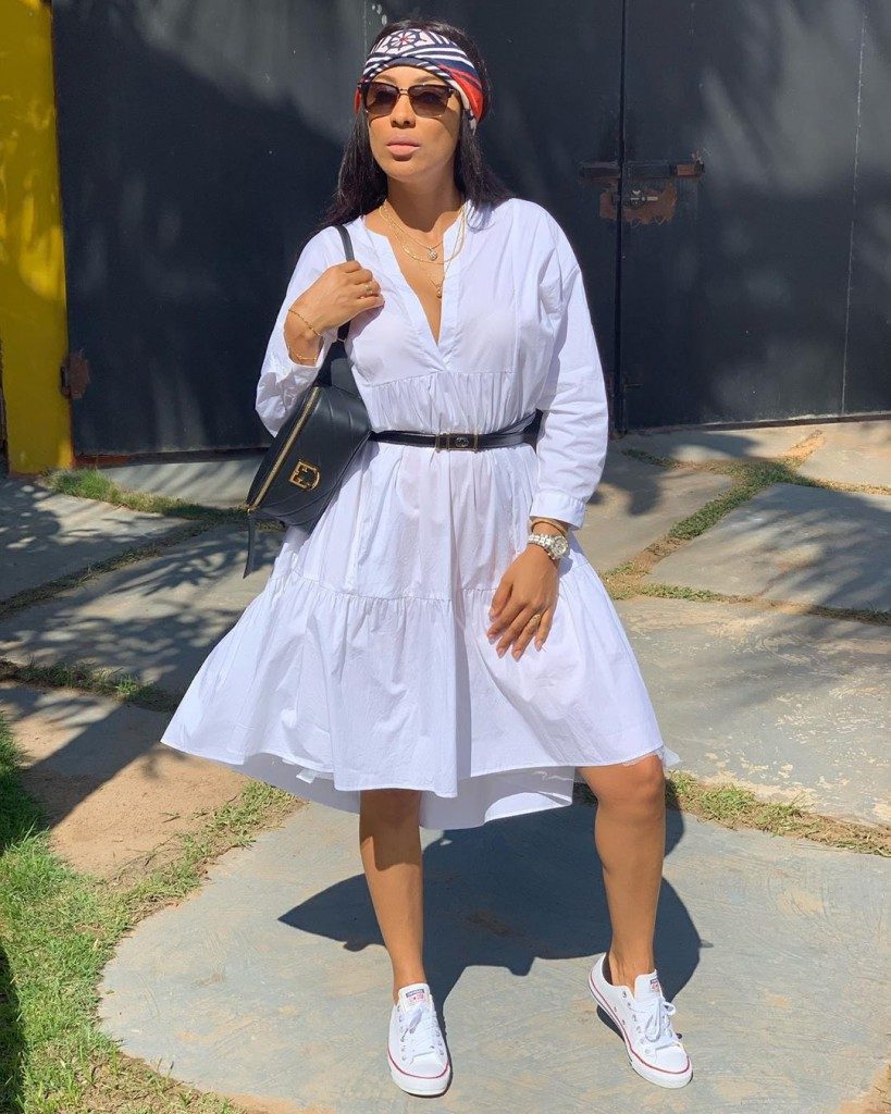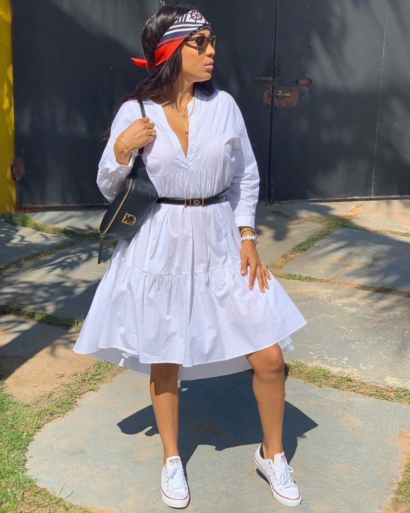 Coveting this spot today, is Ghanaian actress Nikki Samonas. The pretty lady sure knows how to steal hearts! Yes, she just stole ours with her white dress! Though it’s a simple dress, we love the urban touch she gave it with a white sneaker and a matching scarf tied stylishly on her head.