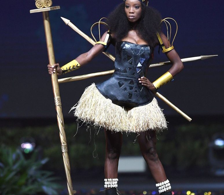 The Dailymail has called Diata’s outfit as fierce! Miss Ghana Diata Hoggar’s costume was inspired by a warrior queen and represented her country’s strength and power. She donned a black leather bodice and a skirt adorned with straw to highlight Ghana’s connection to the earth and sun. On top of her head, she wore a sunlight headpiece of gold.