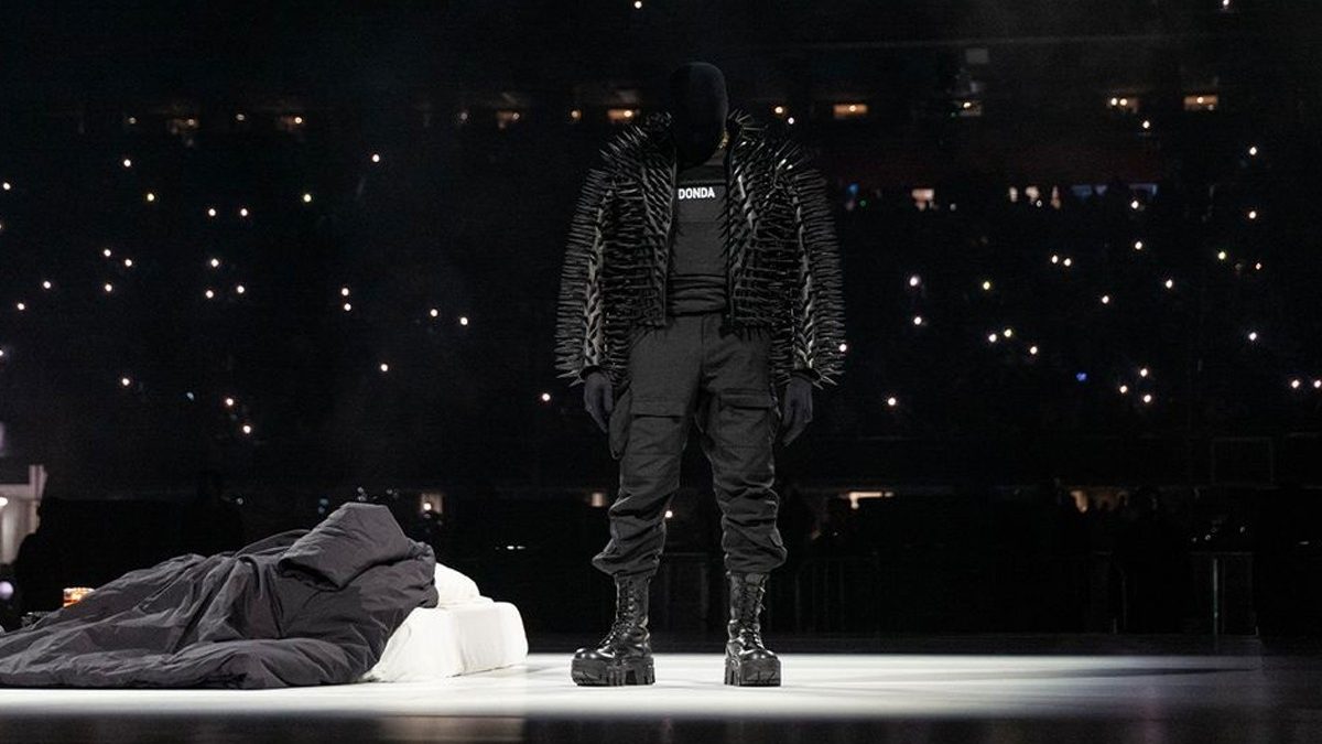 Kanye West Fashion Statements Era DONDA Balenciaga Fall 2020 Spiked Rubber Leather Jacket Mercedes-Benz Stadium Atlanta Listening Party Music Rapper Kim Kardashian Face Covering Balenciaga Demna Gvasalia Rick Owens Bottega Veneta The Row Rei Kawakubo