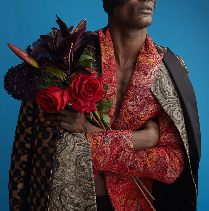 Men’s fashion editorial titled MANifesto showcases masculine vulnerability by unraveling tailoring similar with menswear, through “undone” multiple layers, half-worn jackets, and the introduction of floral arrangements.