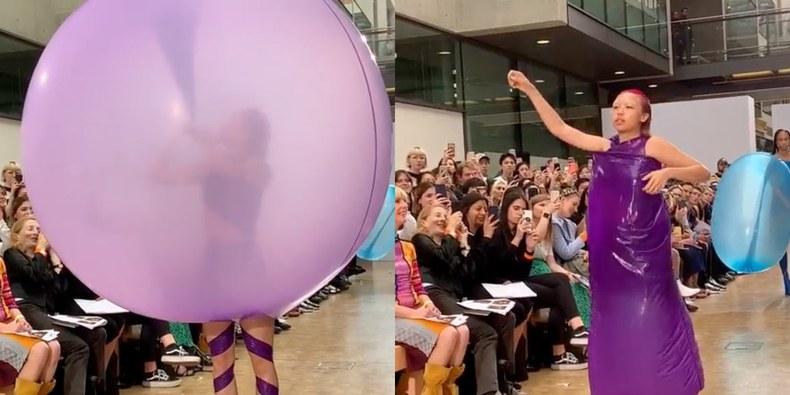 For the CSM BA Fashion show, Tjærandsen went to great lengths to secure models and performers who do not get claustrophobic. And, yes, there’s a generous air supply inside each bubble. “It’s filled with oxygen, so there’s about two to three thousand litres of oxygen inside. A human breathes 480 litres of oxygen an hour, so you’ve got roughly three hours in the dress,” the designer revealed. “I started inflating the dresses after the show started, so the models are not in the bubble for more than 30 minutes.”