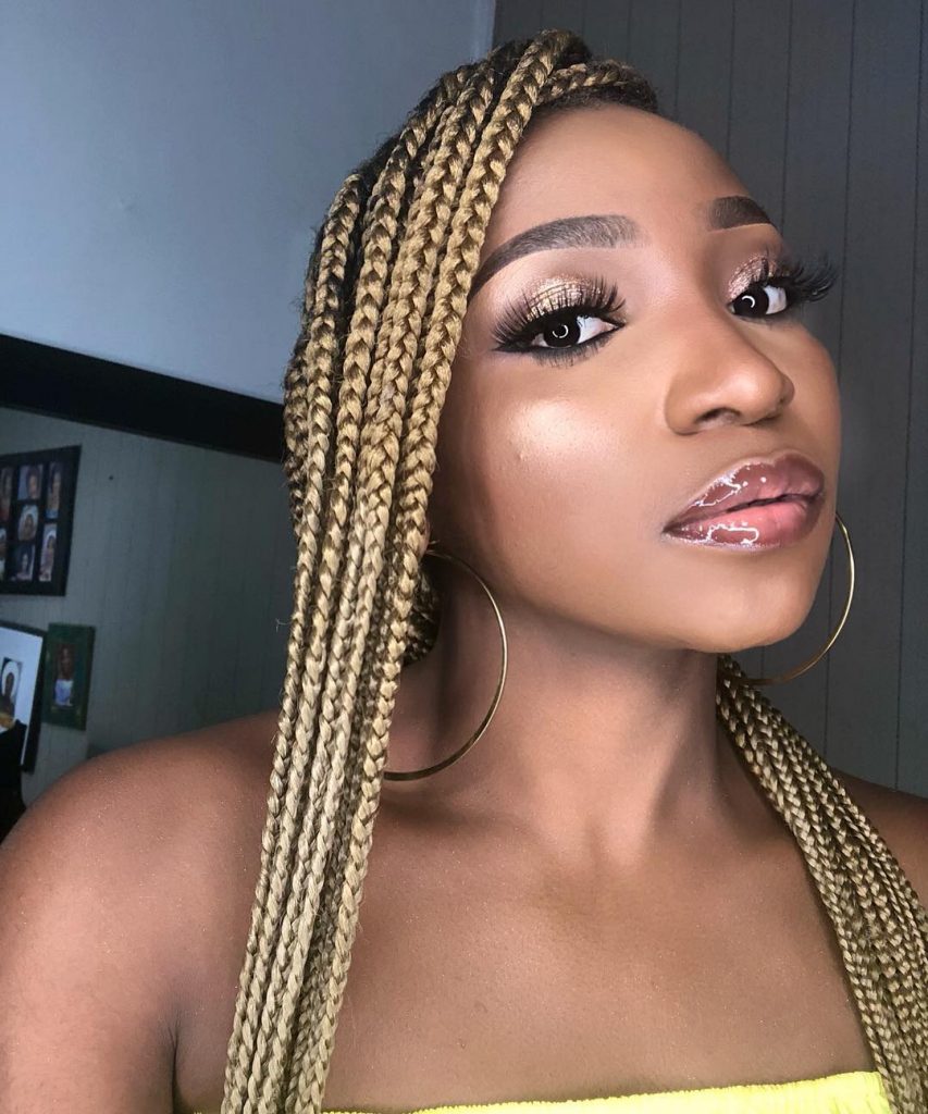 Fluttery false eyelashes, well-outlined brows, gold eyeshadow and lots of mascara accentuated Omowunmi’s matching yellow top and blonde braids.