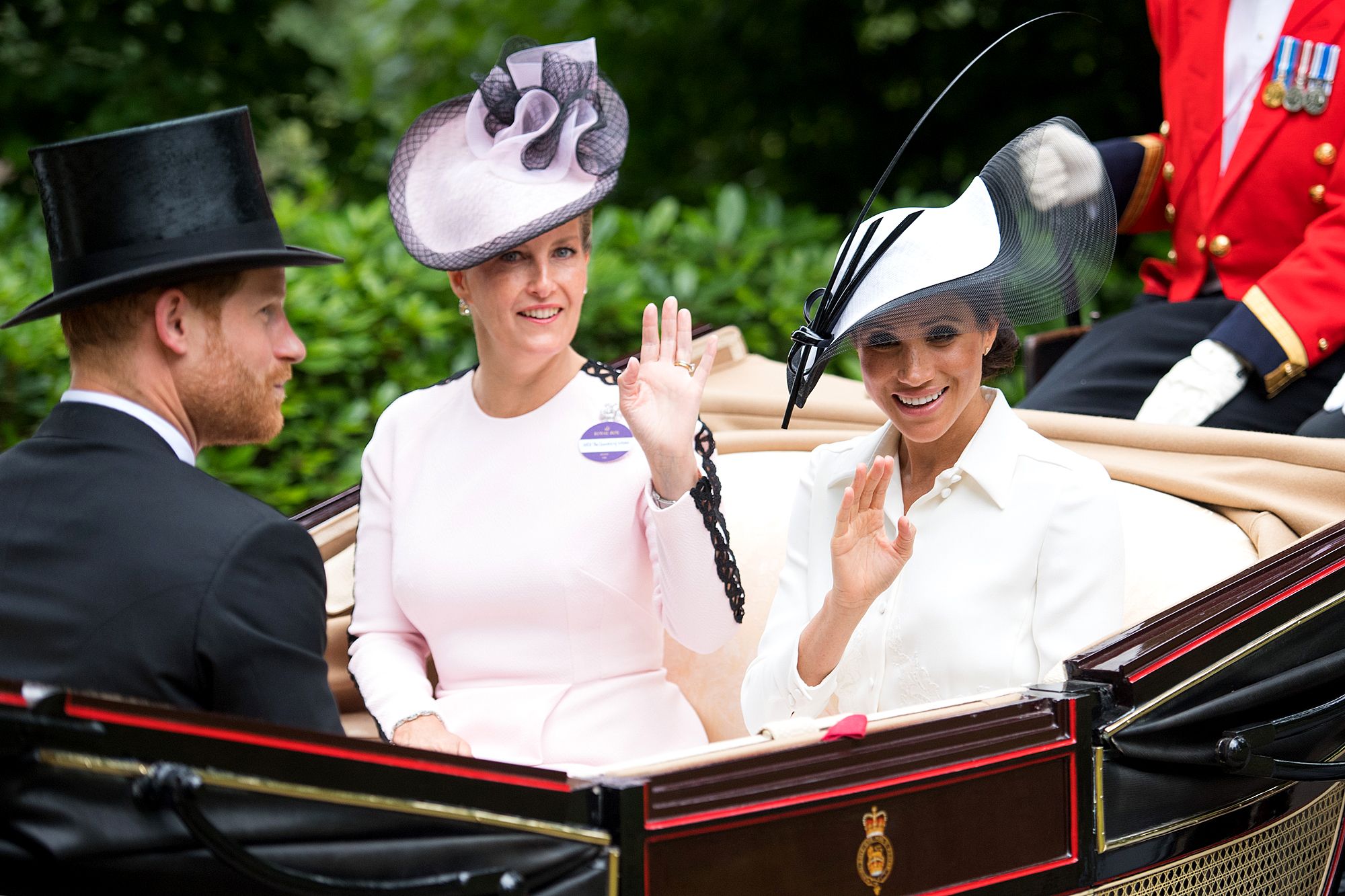 The Duke and Duchess of Sussex rode in a carriage ride onto the course for the opening event, joining Queen Elizabeth, Prince Edward and Sophie, the Countess of Wessex.