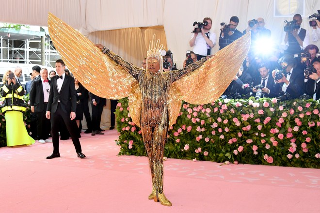 Billy Porter shut down the Met Gala red carpet when he arrived on a litter—carried by six shirtless men!—in a theatrical nod to Ancient Egypt. The Posestar’s custom “Sun God” ensemble, by The Blonds, included a bejeweled catsuit outfitted with 10-foot wings, a 24-karat gold headpiece, as well as custom gold-leaf Giuseppe Zanotti shoes and fine jewels by Andreoli and Oscar Heyman. The mic-drop served as half fashion moment, half performance art—perfectly executed on an evening when stars were asked to unleash their utmost creativity.