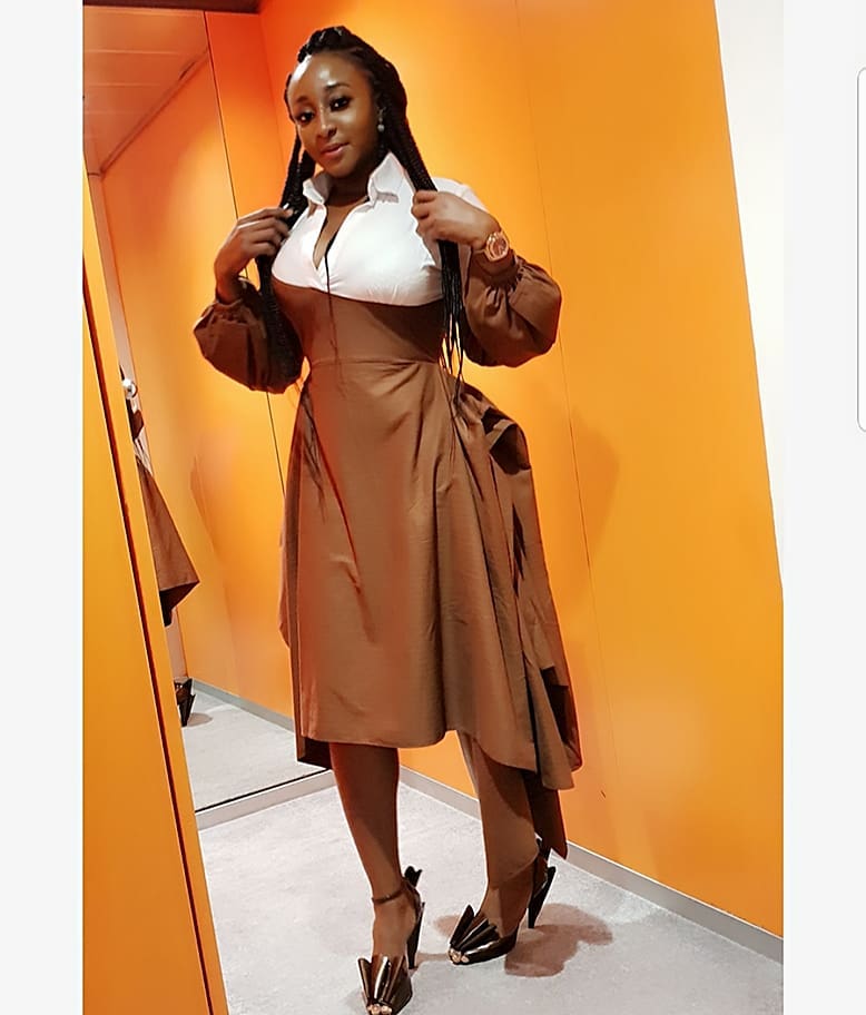 After showing off her airport style with the chicest black ensemble, Ini Edo has taken to Instagram once again to display her striking figure in a jaw-dropping color-blocked gown.