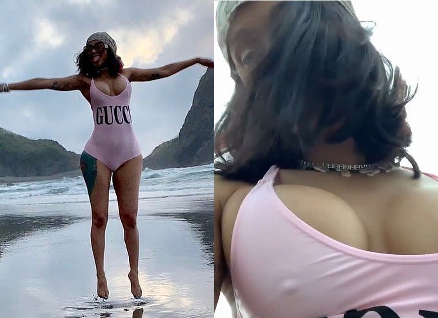 Rapper and mother of one, Cardi B, enjoyed a trip to the beach in New Zealand on Thursday and took to her Instagram Stories to flaunt her very ample cleavage in a swimsuit.