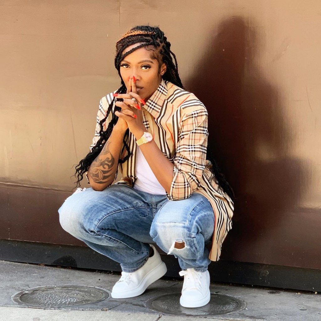 The mother of one lands our most coveted spot of ‘Street Style Look Of The Day!’. Wearing a boyfriend Burberry shirt, V-necked t-shirt, and a pair of ribbed baggy jeans. She paired the tomboyish look with a white sneaker, gold watch and rings. Her black and brown mix braided free flowing hair gave her the girly appeal, making her look like the Queen Tiwa that we know!