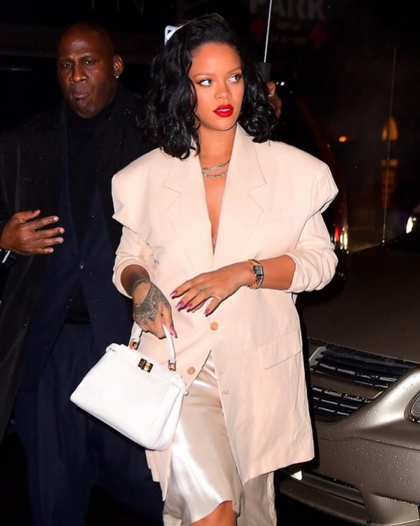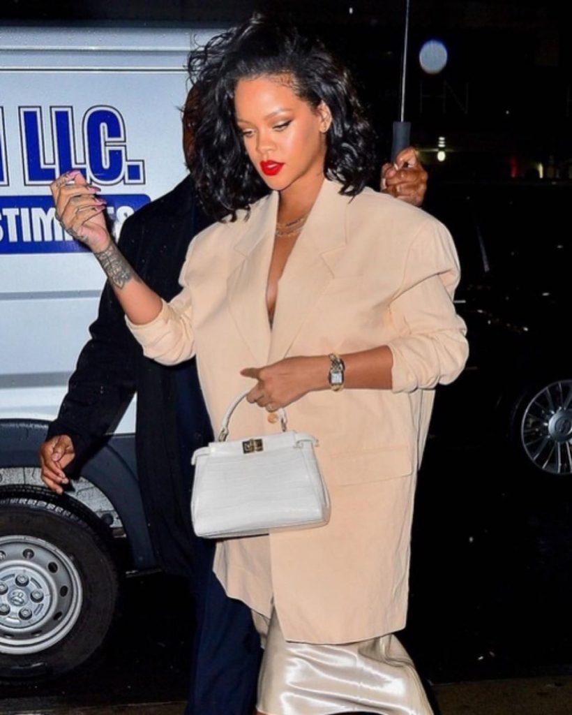 On Tuesday, the songstress was a beauty in beige as she stepped out in New York City wearing an outfit more appropriate for warmer weather. Seemingly unfazed by the weather forecast, Rihanna wore a silky, blush-colored skirt with a matching oversized Y/Project blazer paired with sans shirt.