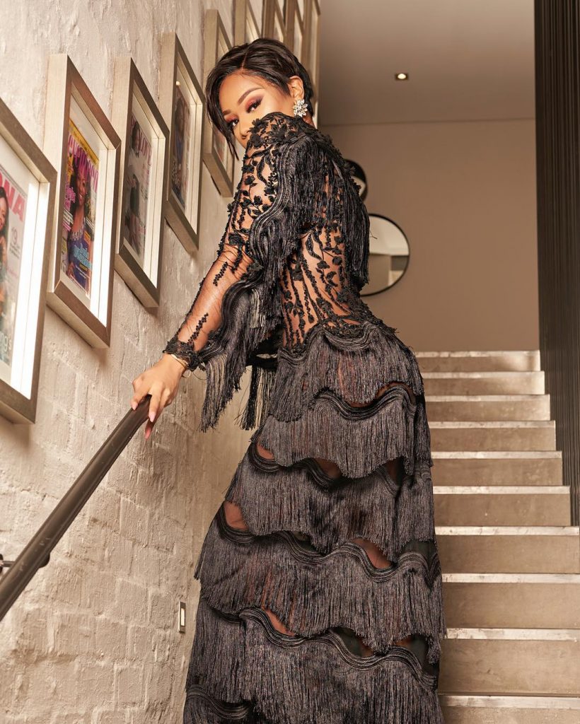 South African television personality, Bonang Matheba is way chicer than you thought in an all-black ensemble by Villioti Fashion Institute. While attending a close friend’s birthday dinner today, Bonang served us with an ankle length all black Chantilly lace dress.