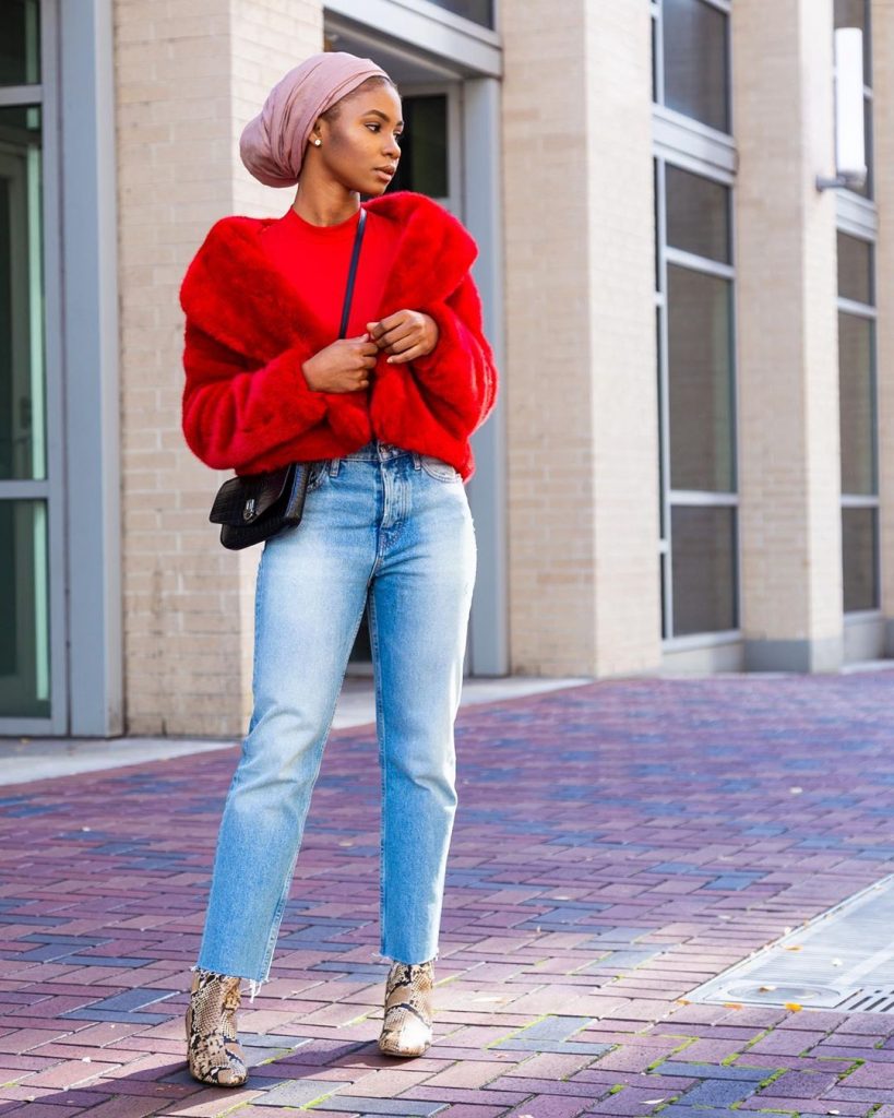 The gorgeous Muslimah wore a vibrant red faux top, jacket and frayed denim pant that as usual turned heads. However, not just with her outfit, the striking blogger was at her radiant best with snakeskin booties just stunning enough to frame her whole feet.