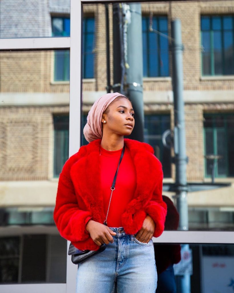 The gorgeous Muslimah wore a vibrant red faux top, jacket and frayed denim pant that as usual turned heads. However, not just with her outfit, the striking blogger was at her radiant best with snakeskin booties just stunning enough to frame her whole feet.