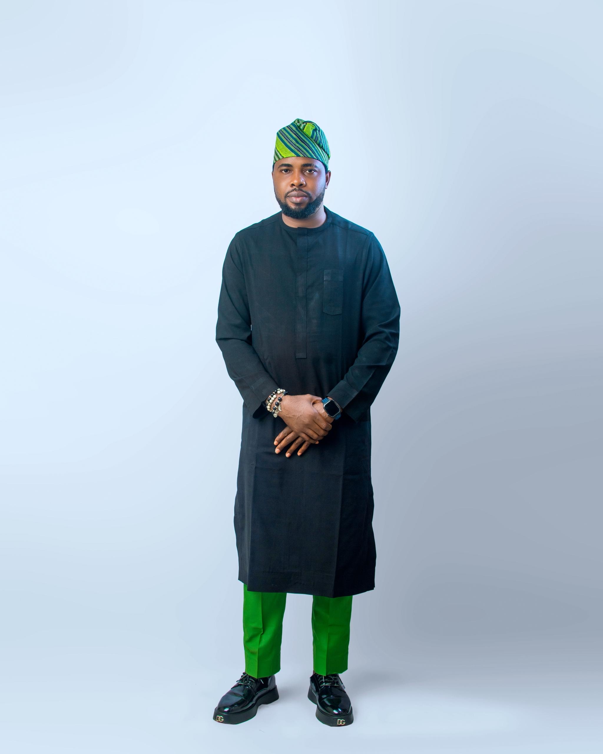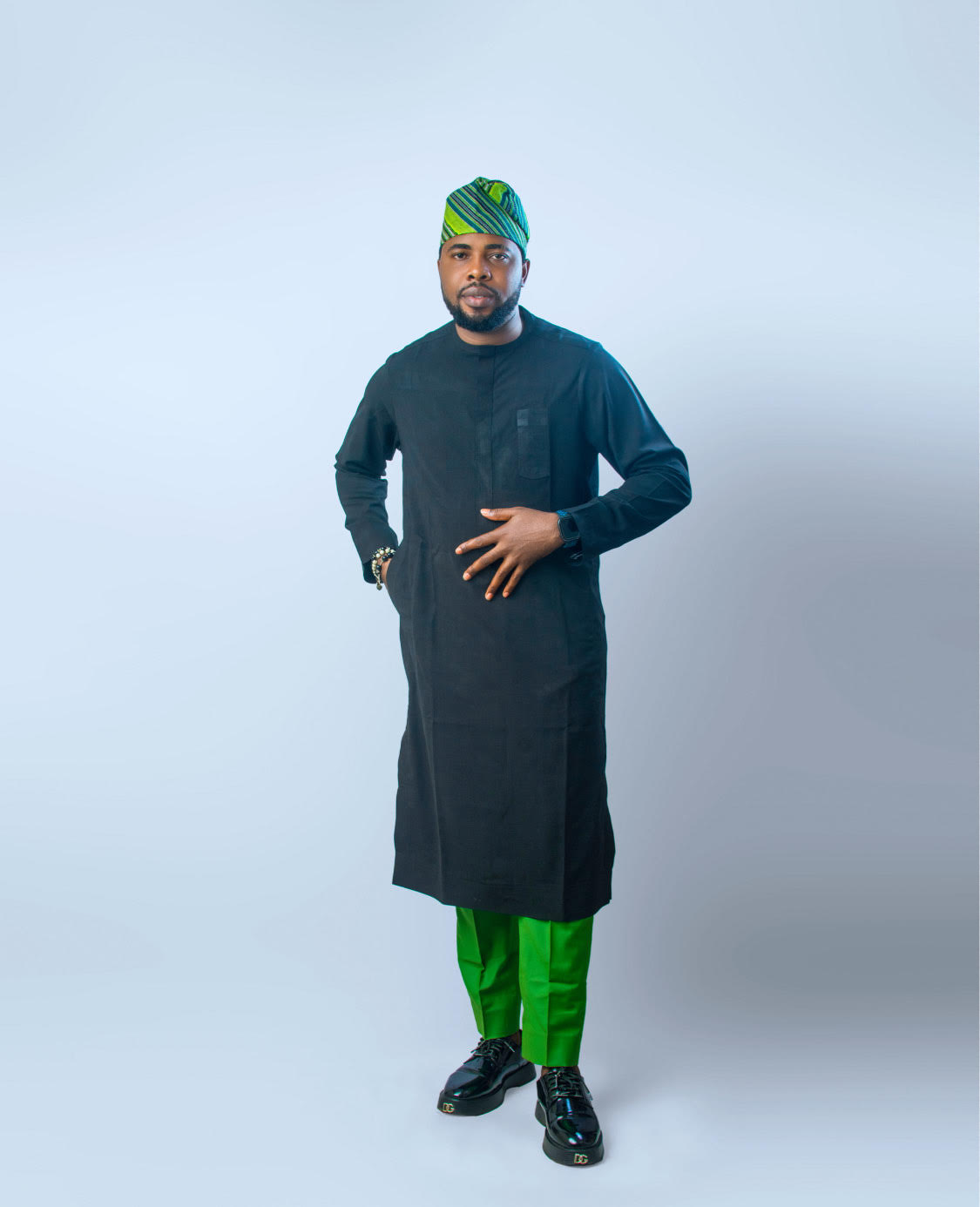 The look finds its energy in the trousers. A burst of green interrupts the dark canvas with electrifying confidence. Green is the colour of renewal and individuality, offering contrast that feels fresh rather than rebellious. Completing the ensemble is a striped green cap, a cultural anchor that harmonizes the palette. The Effin Kaftan is not loud; it does not need to be. Its strength lies in quiet confidence, designed for men who command respect without demanding it.