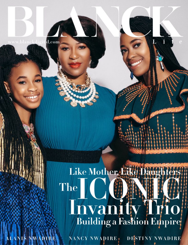 Blanck Magazine UK has just released its latest issue of Black Lite 8 and it features three generation of designers as its cover star. The creative designer of luxury fashion brand Iconic Invanity, Nancy Nwadire graces the cover flanked by her two budding fashion star daughters,  Destiny & Alanis Nwadire