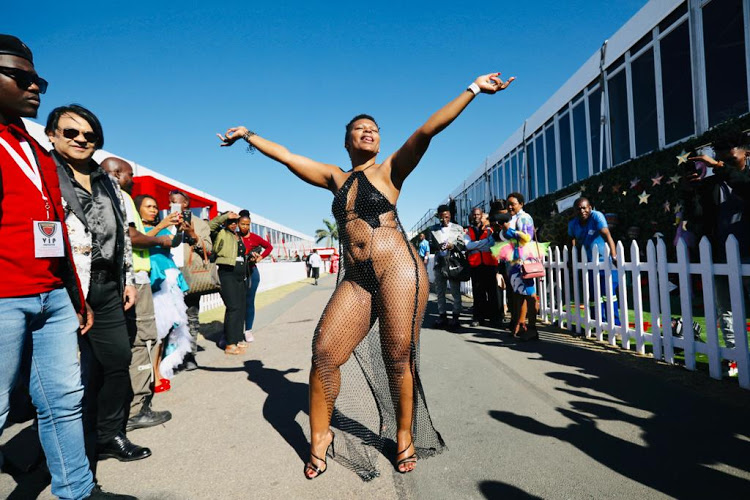Zodwa Wabantu set tongues wagging when she arrived at the Vodacom Durban July on Saturday in a sheer, crystal-encrusted dress that left little to the imagination.